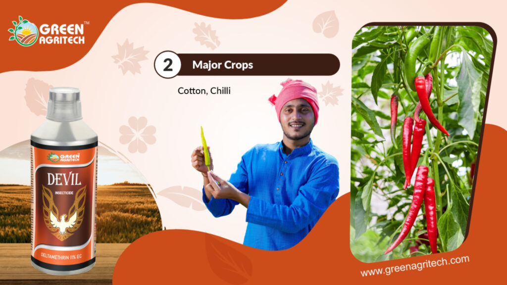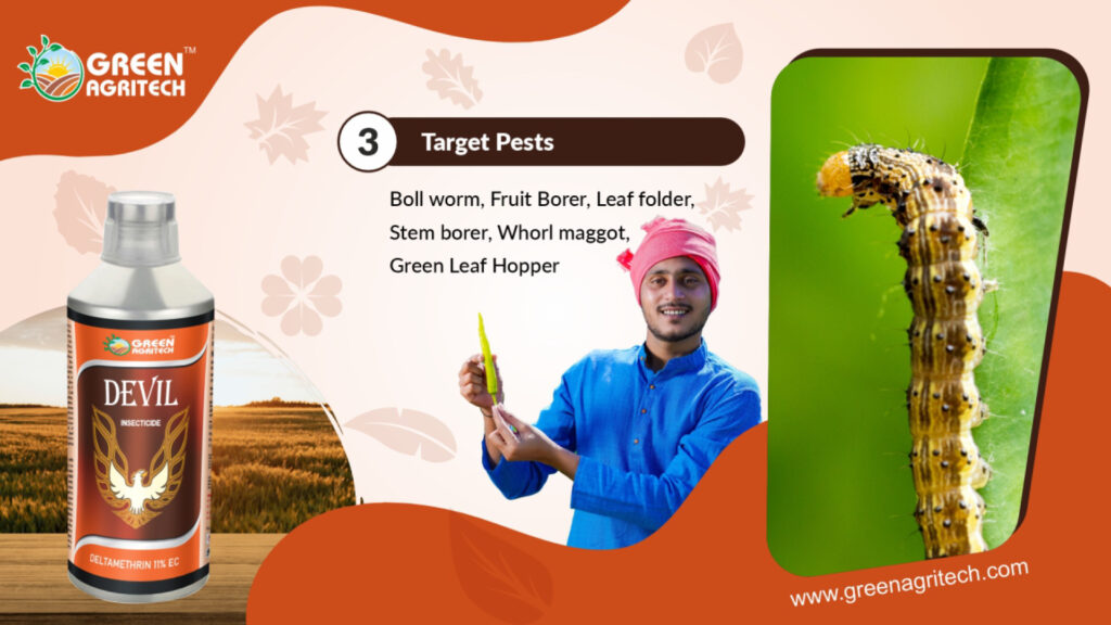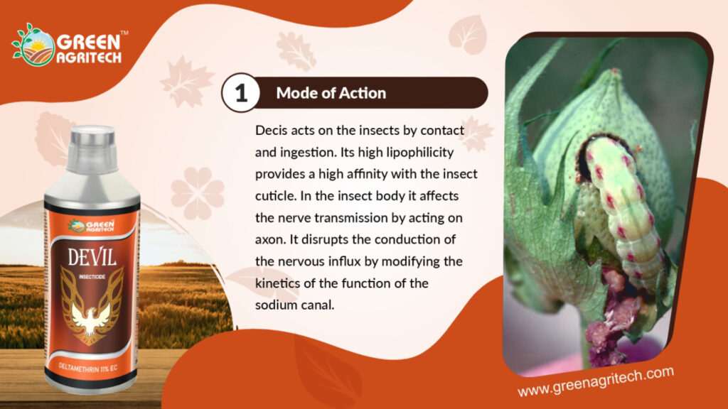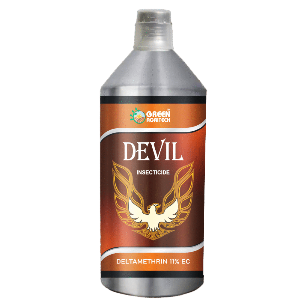 Deltamethrin 11 % EC is a broad-spectrum, contact, and stomach-action insecticide used in agriculture to control a wide range of chewing and sucking insect pests. As a pyrethroid, it disrupts the nervous system of insects, leading to paralysis and death. The “11% EC” refers to the formulation: an Emulsifiable Concentrate (EC) containing 11% deltamethrin as the active ingredient.