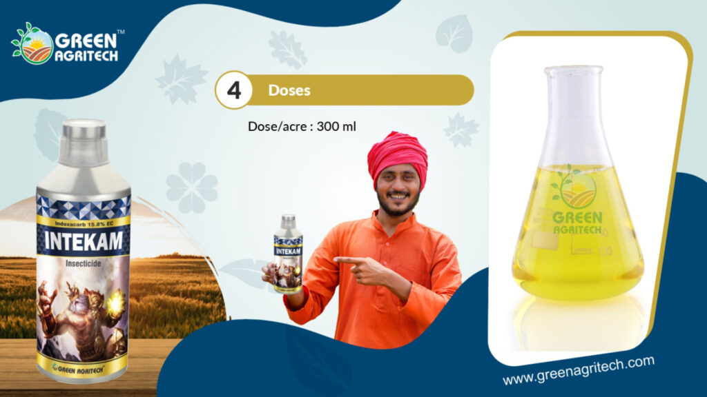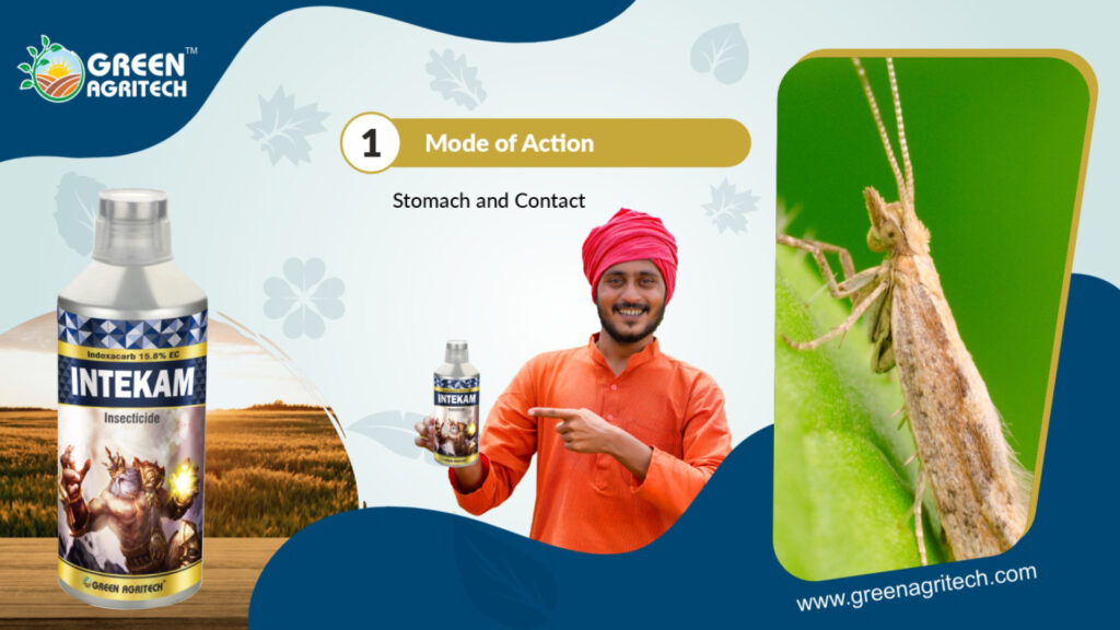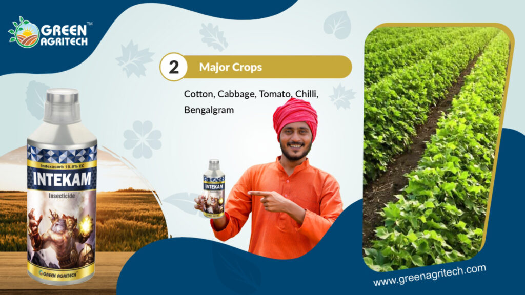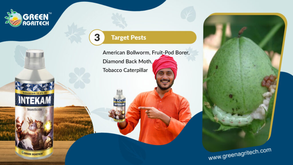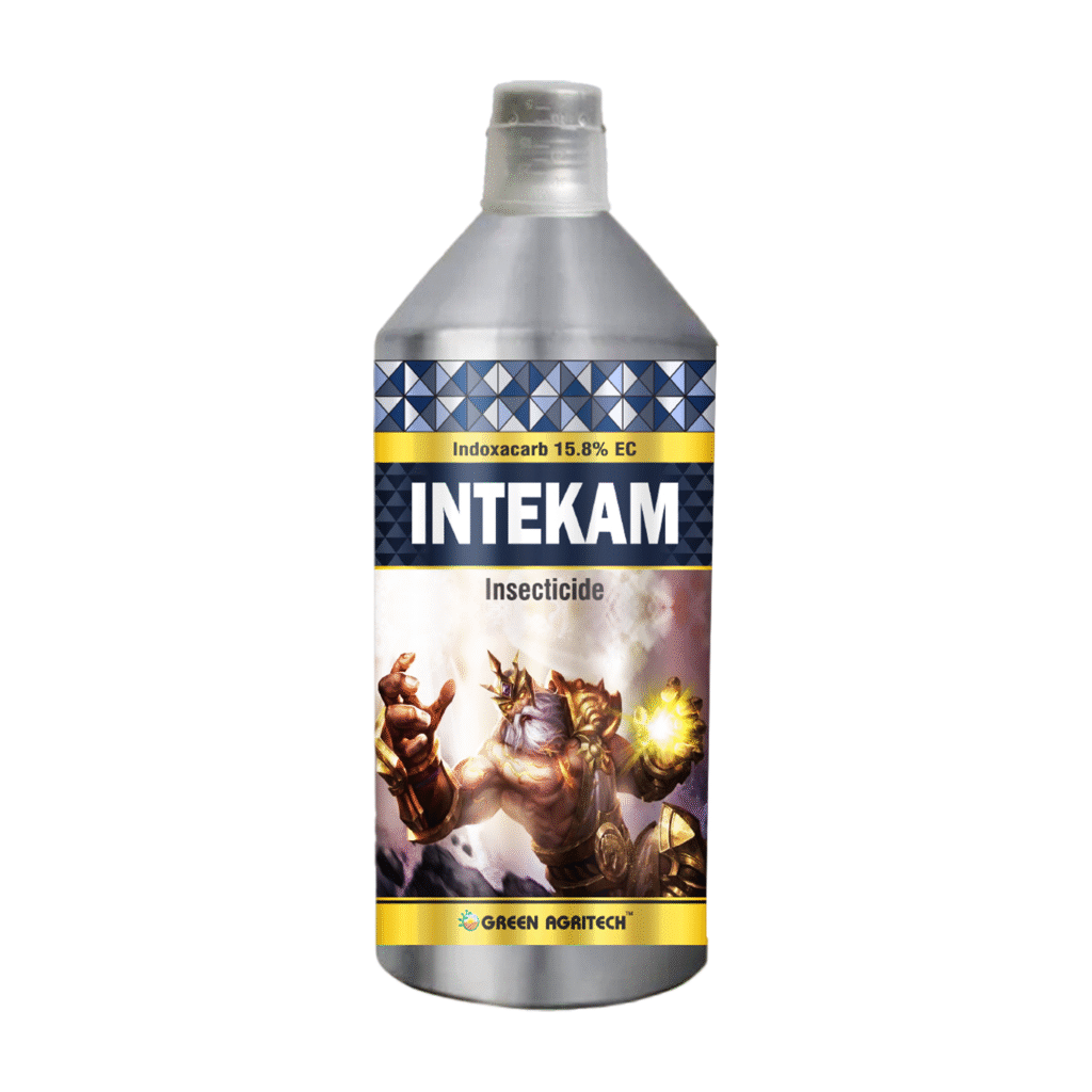 Indoxacarb 15.8 % EC is a liquid insecticide formulated as an emulsifiable concentrate (EC), containing 15.8% of the active ingredient indoxacarb, which controls a wide range of caterpillars and other insect pests through stomach poisoning and contact action. This insecticide is effective against pests like bollworms, pod borers, and diamondback moths in crops such as cotton, cabbage, and pigeonpea. It works by disrupting the insect’s nervous system, leading to paralysis and death.