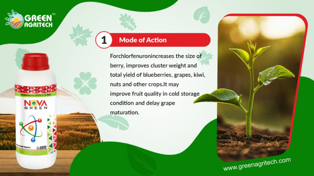 Forchlorfenuron (CPPU) 0.1% liquid is a plant growth regulator containing a synthetic cytokinin used to increase fruit size, improve yield, and delay crop maturation in a wide variety of fruits, vegetables, and other crops. It works by enhancing cell division and expansion