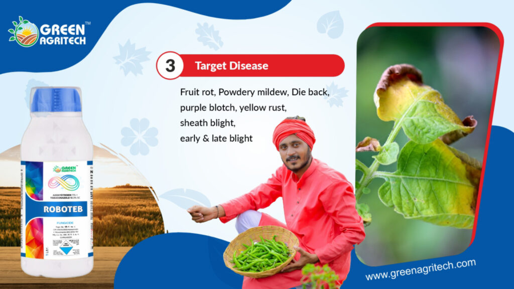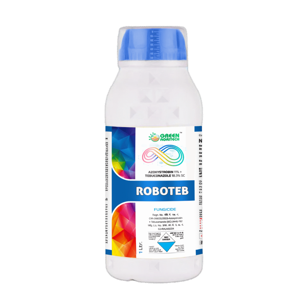 Azoxystrobin 11% + Tebuconazole 18.3% SC is a broad-spectrum, dual-action fungicide used to control a wide range of fungal diseases in crops. It is a formulation that combines the active ingredients Azoxystrobin and Tebuconazole into a suspension concentrate (SC).